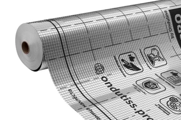 ONDUTISS PRO Termo+ (Termo Plus) - профессиональная четырехслойная пароизоляционная полиэфирная пленка с металлизированной поверхностью и основой из полиэтиленовой пленки с армирующей сеткой. Отражающий строительный материал для снижения теплопотерь и улучшения энергоэффективности конструкций. Выпускается в намотке 75 м2 - площадь рулона. Плотность, г/м²: 100 ± 5%. Прочность, Н/50 мм: не менее 350 / 220. Паропроницаемость, г/(м²*24 ч): не более 5. Аналог - ONDUTISS Reflex (снят с производства).