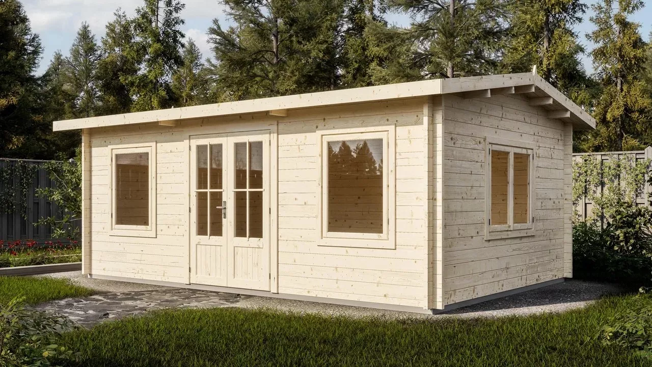 Садовый домик классической формы размером 6×4 м с двускатной крышей и общей площадью 21,3 м² идеально подходит для комфортного обустройства внутреннего пространства. Три окна и остеклённые двери позволяют естественному свету проникать внутрь, создавая уютную и светлую атмосферу.